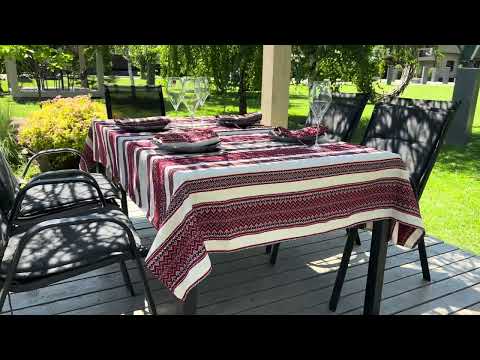 A tablecloth is an indispensable element of kitchen or dining room decoration. Ukrainian-style tablecloth is a family amulet. Traditional Ukrainian ornament on the tablecloth will make the interior thematic. The fabric has the effect of three-dimensional embroidery and the texture of natural linen.